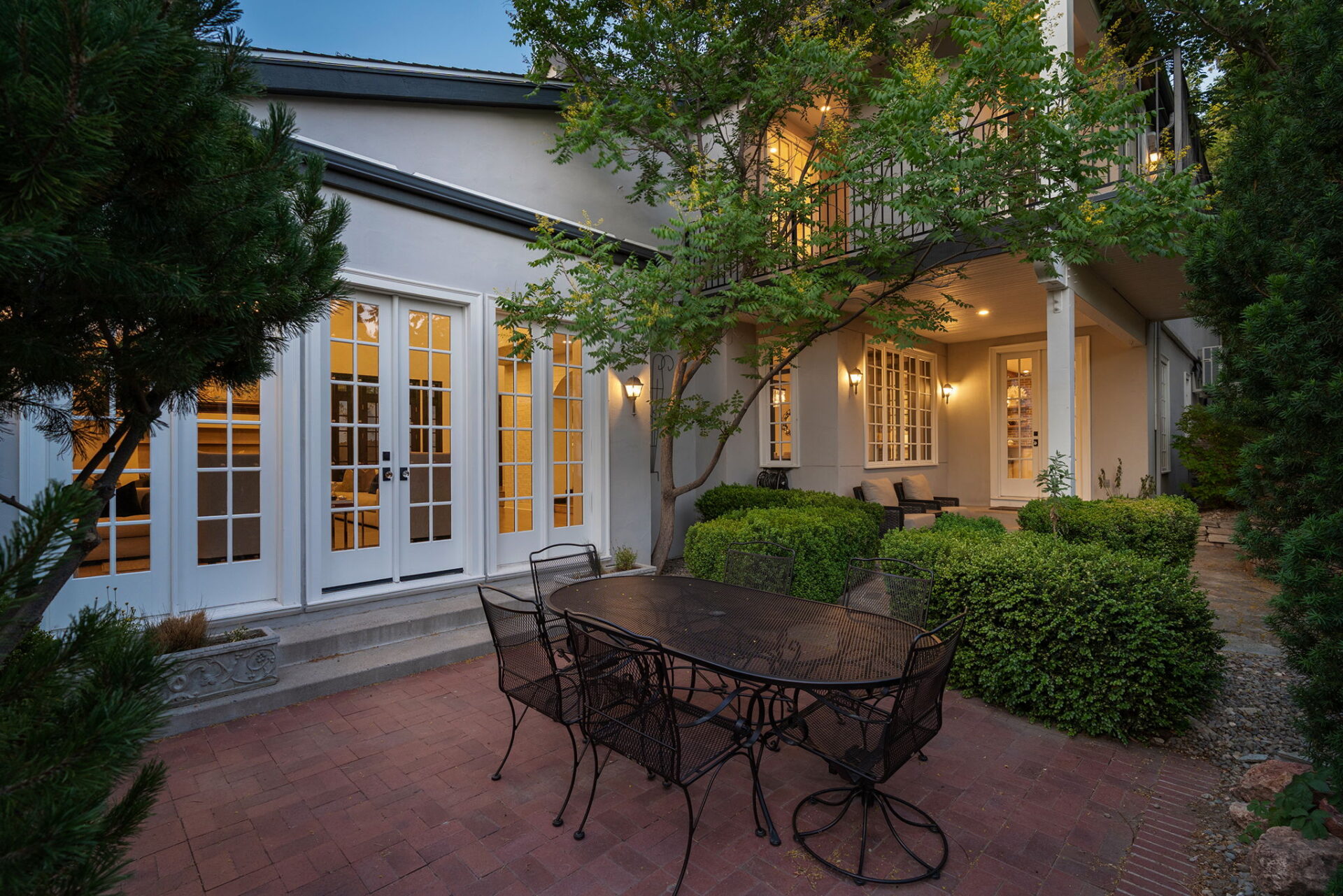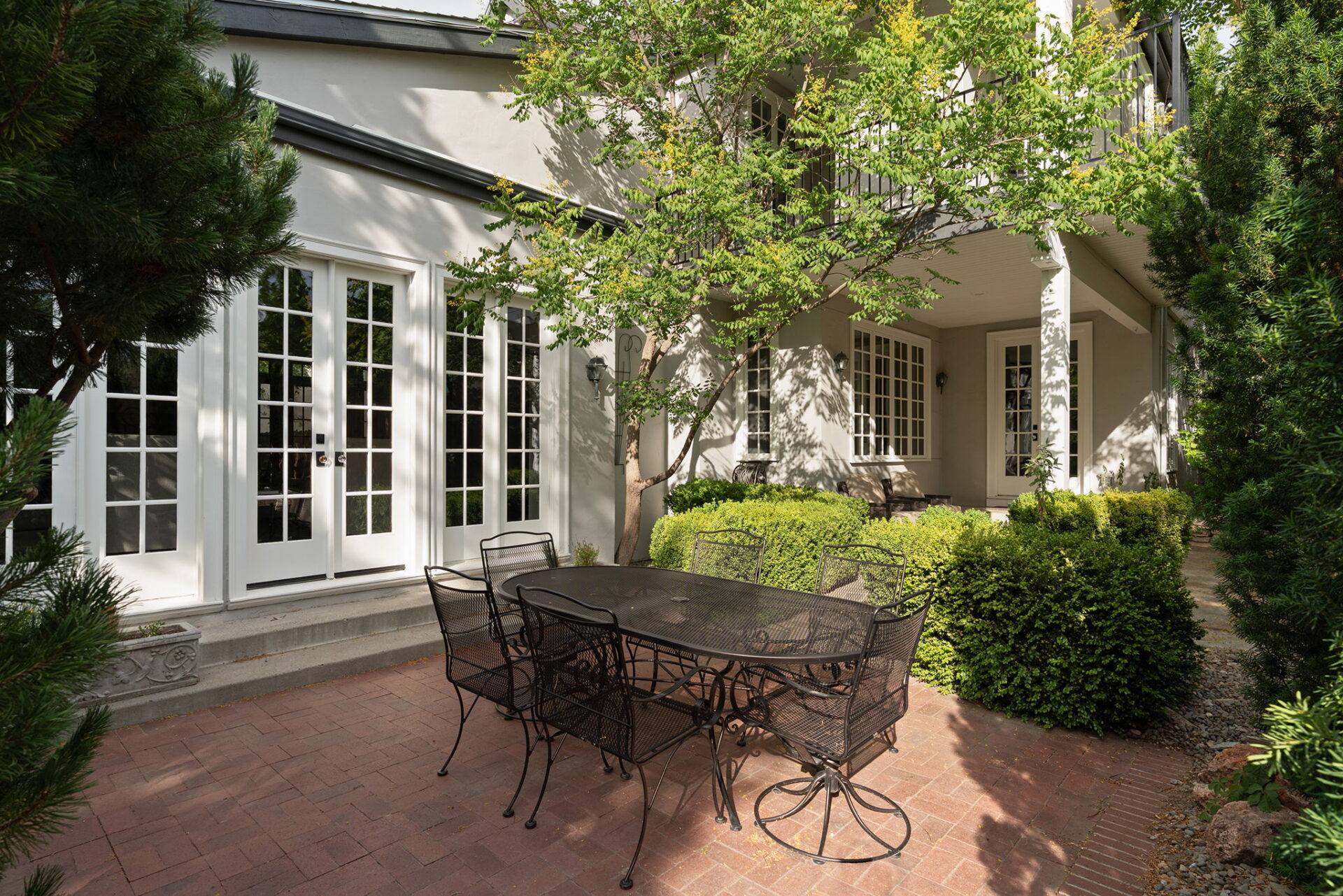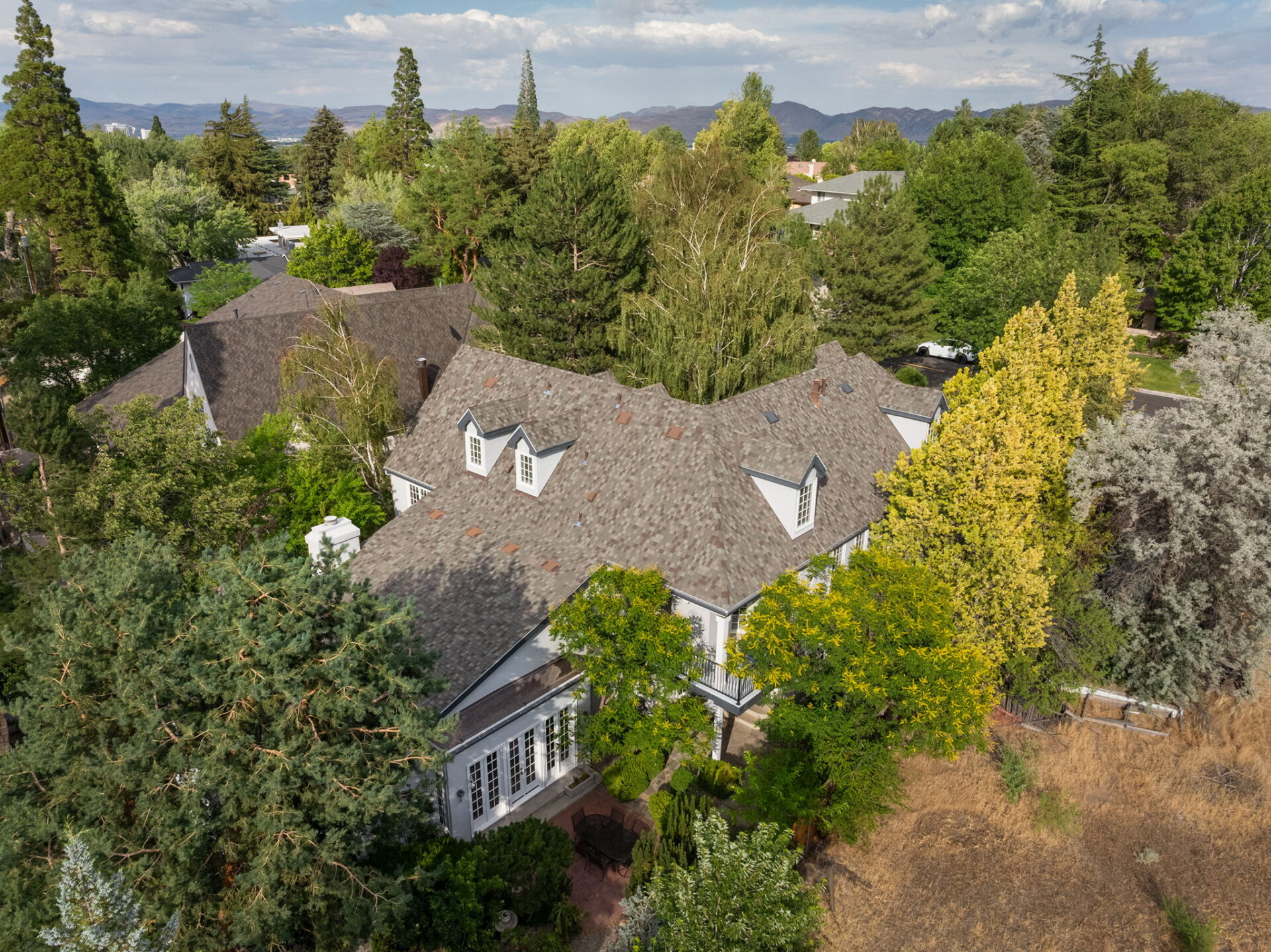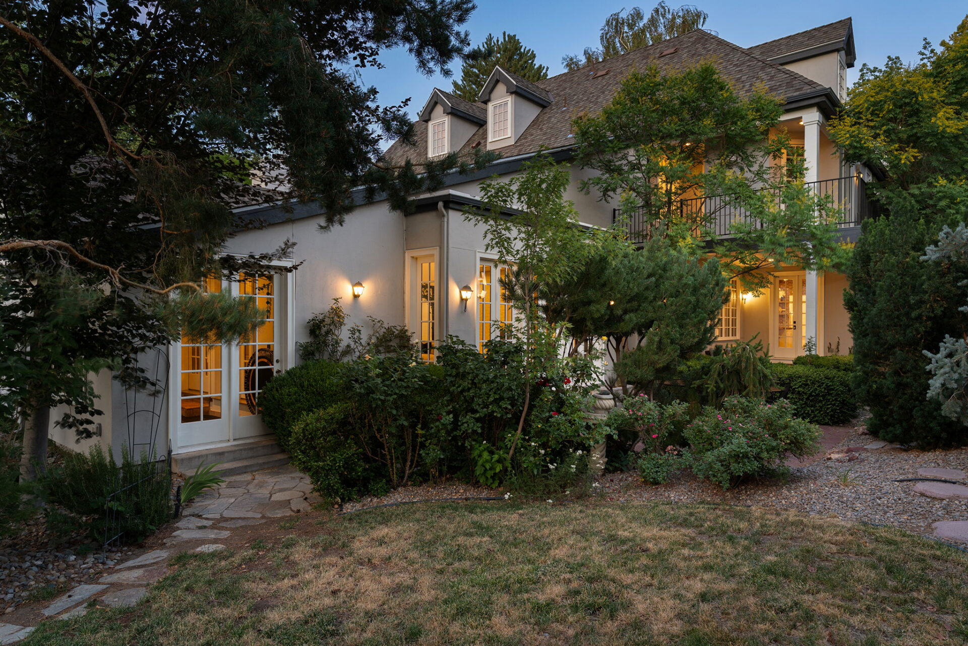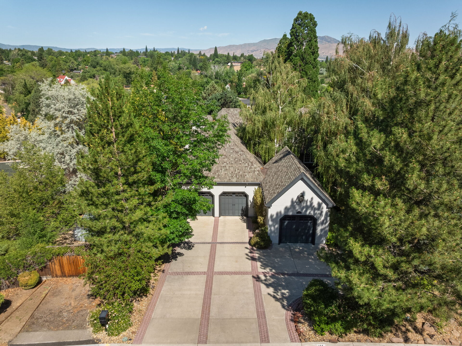 Every detail and corner tells a story, and the right buyer will feel it instantly. From the moment you step into the entry hall, it’s clear this isn’t a typical home. Artisan plaster walls, solid wood doors, and hand-honed finishes whisper of craftsmanship rarely seen in modern builds. The main-level suite has a fireplace, private terrace, radiant heated floors, and a boutique-worthy closet with floor-to-ceiling built-ins for seamless organization. Upstairs, a two-bedroom wing with a shared lounge and dry bar creates a tucked-away apartment-like zone—perfect for teens, guests, or anyone who values autonomy without absence. A second en-suite bedroom on the main level provides long-term flexibility for guests or multigenerational living. Another vaulted-beam bonus room offers space for a home office, media lounge, or creative studio. Vaulted ceilings with exposed beams and an arched fireplace give the living room architectural weight, while dual chandeliers add a subtle elegance. A grid of French doors and windows shapes the room’s rhythm and light. Despite its scale, the space envelops you with a built-in library and corners in which to gather or disappear. Off the living room, a converted garden studio with original brick floors serves as a home gym with views of the lush exterior. The kitchen invites you to make meals, memories, and moods. Brickwork and wood beam ceilings echo the entry and exterior, carrying the home’s language forward with warmth and texture. Custom cabinetry with soft-close drawers surrounds high-end appliances—including dual Sub-Zero refrigerator drawers, Café double ovens, Viking warming drawer, and a U-Line ice maker. A DCS Fisher & Paykel gas range with integrated ventilation stands ready for everything from weeknight dinners to holiday feasts. The dumbwaiter from the garage is a functional delight and a favorite party trick. Even the laundry room and functional closet just off the oversized garage have a point of view. With built-in cabinetry and finishes focused on everyday ease, everyday chores feel like a design moment. The garage features generous dimensions and clean finishes, offering storage and work space beyond parking. Outside, a brick path winds through shaded patios, fruit trees, terraced garden beds, and grassy expanses. Multiple seating areas—some open-air, others tucked beneath eaves—offer places to gather, pause, and exhale. A private courtyard—shaped by layers of landscape and framed by brick—has hosted vow renewals, milestone photos, and other meaningful celebrations over the years. A powered outbuilding with a Dutch door, surrounded by irrigated raised planting beds, anchors a corner of the yard with both purpose and potential. And then there’s the history of Greenridge itself, one of Reno’s original prestige neighborhoods. Developed in the 1930s by Norman Biltz and modeled after luxury subdivisions in Beverly Hills and the East Coast, it once drew names like Doris Duke, Clark Gable, and Marilyn Monroe. Today, the neighborhood has traded celebrity sightings for Halloween magic shows, front-yard wine nights, and strolls with dogs and drinks in tow. People wave from lawn chairs as children roam the curved streets on scooters and bikes, or walk to the nearby golf course for a Coke and fries. Homes like this—so layered, so finished, so cherished—are increasingly rare and even more so in neighborhoods like this.