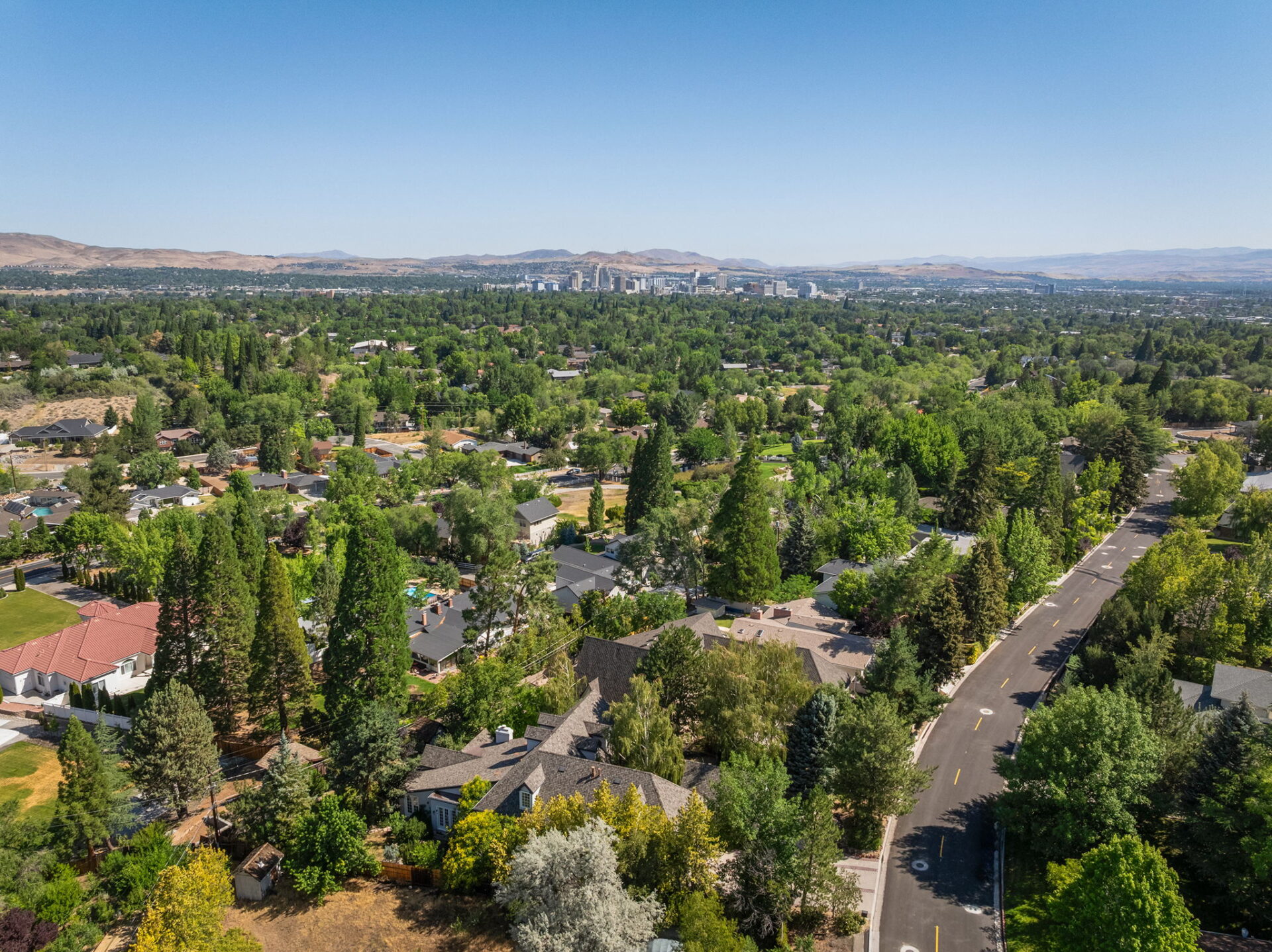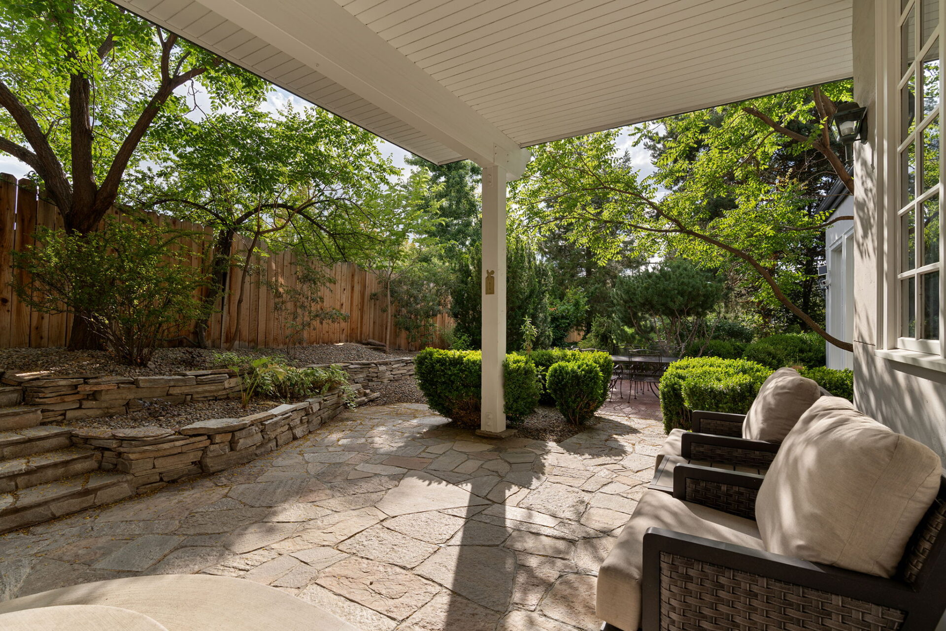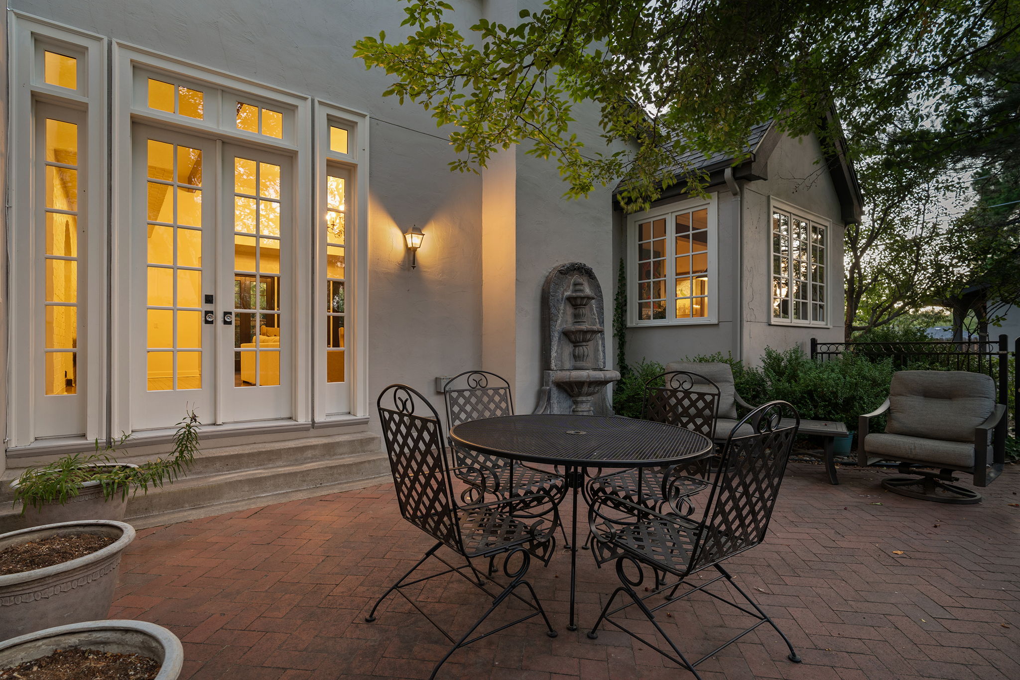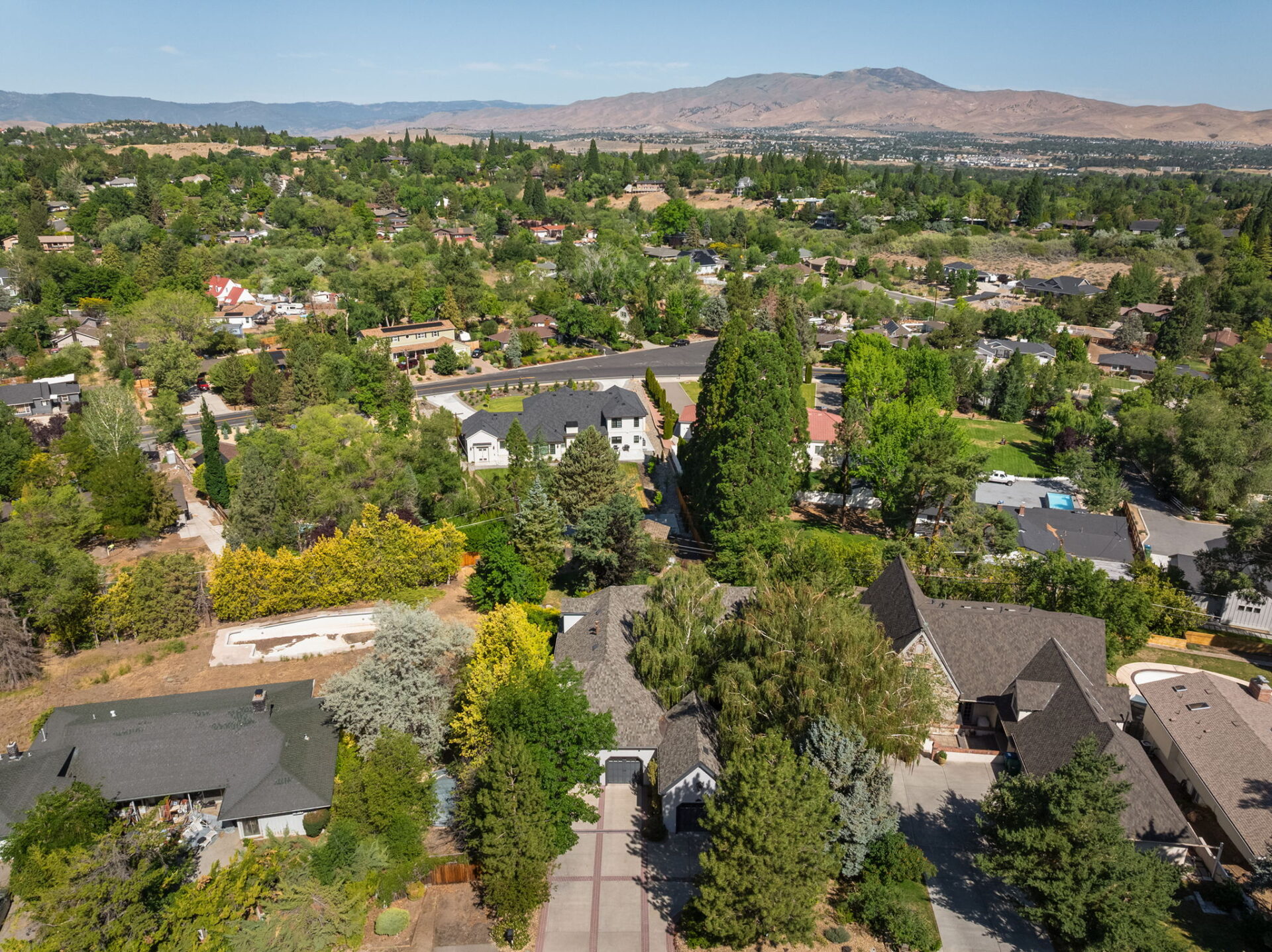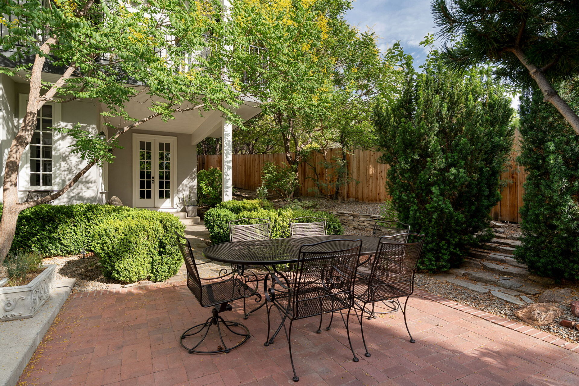 Every detail and corner tells a story, and the right buyer will feel it instantly. From the moment you step into the entry hall, it’s clear this isn’t a typical home. Artisan plaster walls, solid wood doors, and hand-honed finishes whisper of craftsmanship rarely seen in modern builds. The main-level suite has a fireplace, private terrace, radiant heated floors, and a boutique-worthy closet with floor-to-ceiling built-ins for seamless organization. Upstairs, a two-bedroom wing with a shared lounge and dry bar creates a tucked-away apartment-like zone—perfect for teens, guests, or anyone who values autonomy without absence. A second en-suite bedroom on the main level provides long-term flexibility for guests or multigenerational living. Another vaulted-beam bonus room offers space for a home office, media lounge, or creative studio. Vaulted ceilings with exposed beams and an arched fireplace give the living room architectural weight, while dual chandeliers add a subtle elegance. A grid of French doors and windows shapes the room’s rhythm and light. Despite its scale, the space envelops you with a built-in library and corners in which to gather or disappear. Off the living room, a converted garden studio with original brick floors serves as a home gym with views of the lush exterior. The kitchen invites you to make meals, memories, and moods. Brickwork and wood beam ceilings echo the entry and exterior, carrying the home’s language forward with warmth and texture. Custom cabinetry with soft-close drawers surrounds high-end appliances—including dual Sub-Zero refrigerator drawers, Café double ovens, Viking warming drawer, and a U-Line ice maker. A DCS Fisher & Paykel gas range with integrated ventilation stands ready for everything from weeknight dinners to holiday feasts. The dumbwaiter from the garage is a functional delight and a favorite party trick. Even the laundry room and functional closet just off the oversized garage have a point of view. With built-in cabinetry and finishes focused on everyday ease, everyday chores feel like a design moment. The garage features generous dimensions and clean finishes, offering storage and work space beyond parking. Outside, a brick path winds through shaded patios, fruit trees, terraced garden beds, and grassy expanses. Multiple seating areas—some open-air, others tucked beneath eaves—offer places to gather, pause, and exhale. A private courtyard—shaped by layers of landscape and framed by brick—has hosted vow renewals, milestone photos, and other meaningful celebrations over the years. A powered outbuilding with a Dutch door, surrounded by irrigated raised planting beds, anchors a corner of the yard with both purpose and potential. And then there’s the history of Greenridge itself, one of Reno’s original prestige neighborhoods. Developed in the 1930s by Norman Biltz and modeled after luxury subdivisions in Beverly Hills and the East Coast, it once drew names like Doris Duke, Clark Gable, and Marilyn Monroe. Today, the neighborhood has traded celebrity sightings for Halloween magic shows, front-yard wine nights, and strolls with dogs and drinks in tow. People wave from lawn chairs as children roam the curved streets on scooters and bikes, or walk to the nearby golf course for a Coke and fries. Homes like this—so layered, so finished, so cherished—are increasingly rare and even more so in neighborhoods like this.