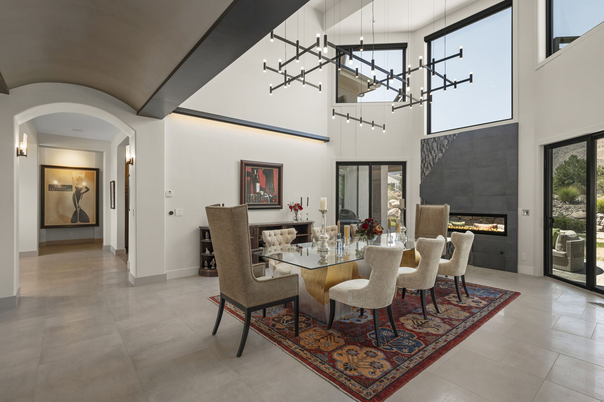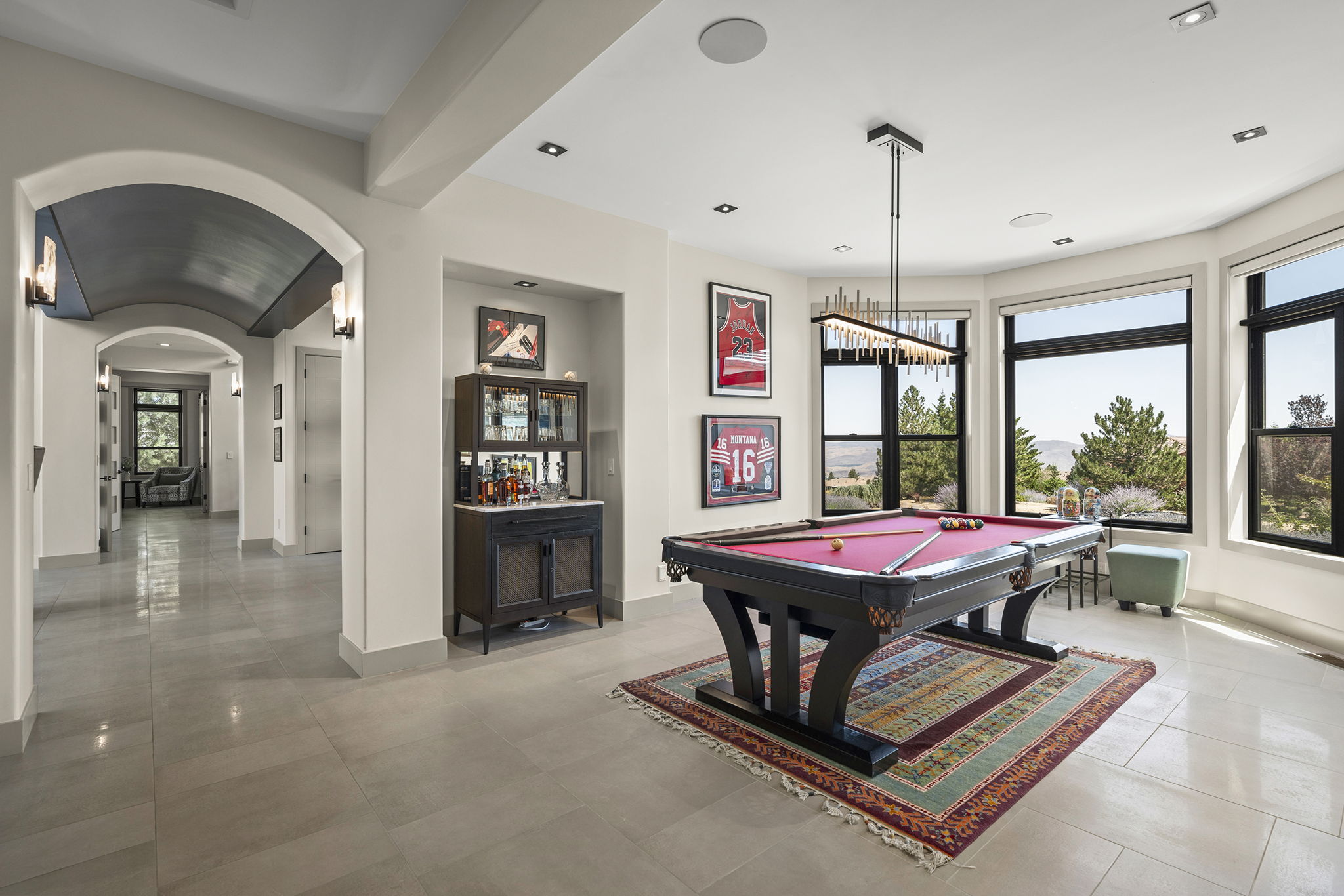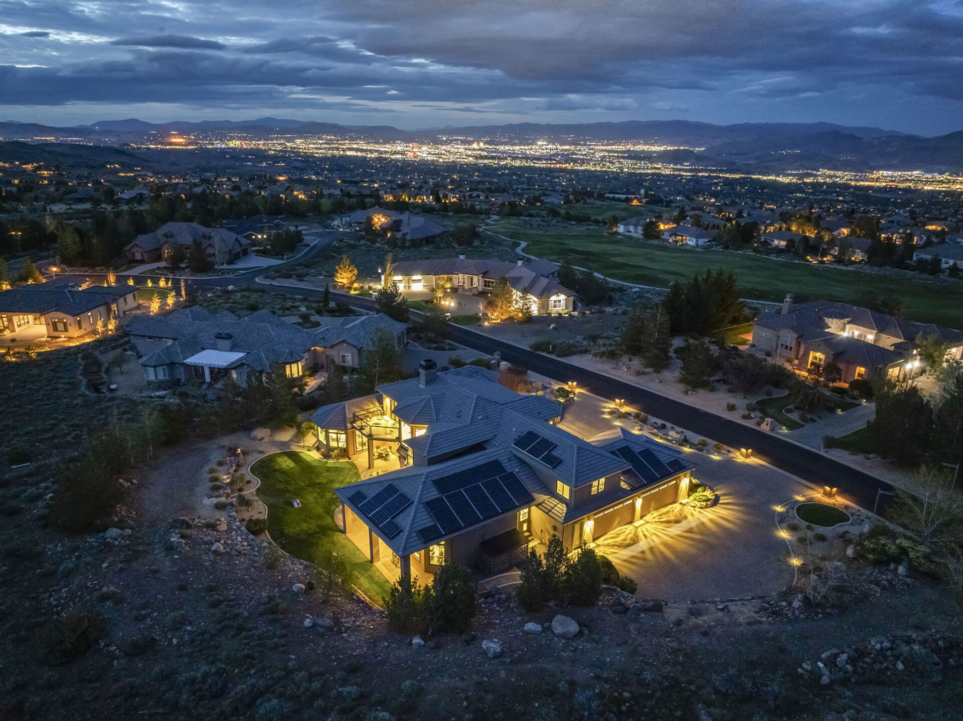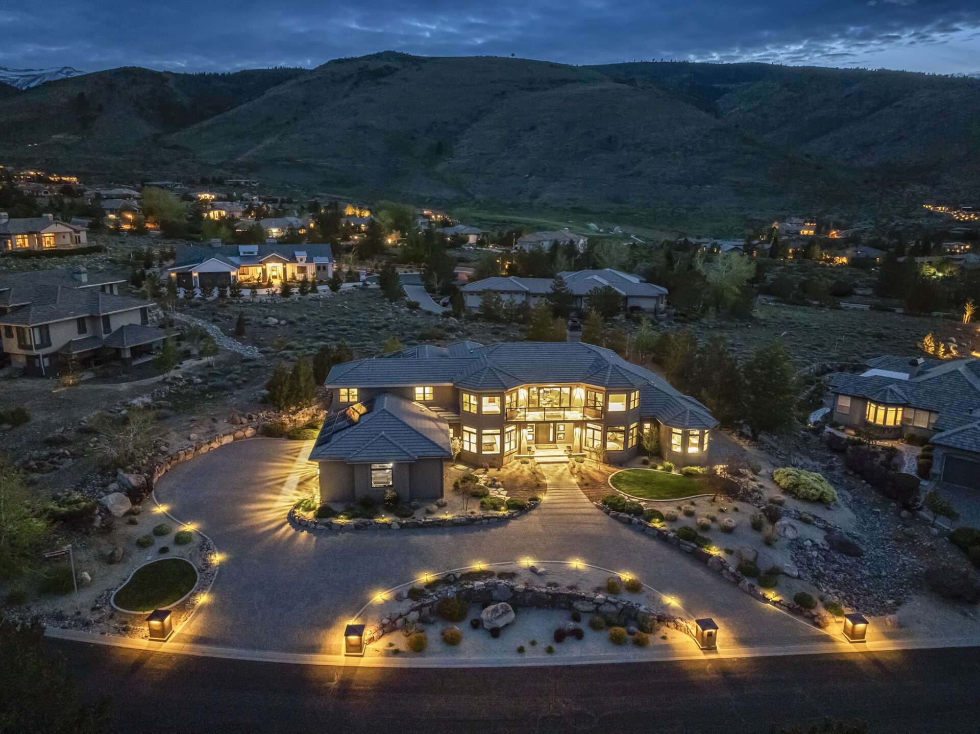 Step into 6177 North Featherstone, a residence reimagined from the ground up to embody the sophistication of design & the effortless grace of High Desert living. Nestled within the prestigious ArrowCreek community, this fully remodeled estate offers 5,586 square feet of inspired living on a full acre. With sweeping views across the Sierra Nevada & Mt. Rose mountains, lush golf fairways, & sparkling city lights, every angle of this home tells a story of elegance & connection to its surroundings. The owners began their remodel with purpose: to create a seamless flow, where form meets function & every detail enhances life, leisure, & entertaining. Walls were softened, pillars removed, & spaces reimagined to capture natural light & open sightlines. Modern finishes & thoughtful design balance grandeur with comfort. A finished basement & upstairs library added 312 square feet, expanding versatility without sacrificing intimacy. Arrival makes an unforgettable impression with a custom 9×6 steel pivot door by Modern Steel Doors of Arizona. Inside, a light-filled foyer leads to an expanded balcony, where sweeping golf course & city views set the stage for sunrise coffee or starlit evenings. At the heart of the home, the Dining Room has been elevated into a dramatic entertaining space with soaring two-story ceilings & a two-sided fireplace connecting indoors & outdoors. Andersen sliding doors open to patios & gardens, while striking Sonneman fixtures & art lighting create ambiance. Whether hosting holidays or intimate dinners, the space adapts with ease. The Main En Suite is a private retreat, complete with custom California Closets, cove lighting, & remote-controlled Hunter Douglas shades. The spa-inspired bath showcases a freestanding soaking tub beneath chandeliers, a dual-entry steam shower with rain head & sprayers, natural stone floors, shimmering glass tile, & custom cabinetry with quartz counters & lighted mirrors. The Great Room centers on a custom travertine fireplace with black quartz mantel, complemented by wood-grain tile floors, a Minka Aire fan, & integrated Sonos audio. The Kitchen & Nook feature a Wolf 48″ range, Sub-Zero refrigerator, & a central island with seating. The Games Room delights with Hubbardton Forge lighting, speakers, & motorized shades. A dramatic staircase of black-stained oak & iron railings rises beneath a cascading Sonneman chandelier. Upstairs, the new Library offers custom bookcases, club seating, & a 12-foot Andersen glass wall opening to a balcony with panoramic views. Four additional en suite bedrooms provide privacy, storage, & character. Outdoors, multiple patios, a two-sided fireplace, & landscaped grounds enhanced with solar lighting create serene gathering spaces. Modern systems include central HVAC with three units, radiant heated floors, Tesla solar panels, Cat-6 wiring, Sonos audio, & a four-car garage with EV charger. This estate is more than a home—it is a lifestyle. From morning coffee on the balcony to wine in the library at dusk, from quiet family nights to grand celebrations, this residence harmonizes elegance, comfort, & versatility. Every space has been thoughtfully crafted, every view a reminder of Reno’s beauty. This is a rare opportunity to own a fully realized vision of home, where luxury & ease coexist seamlessly.
