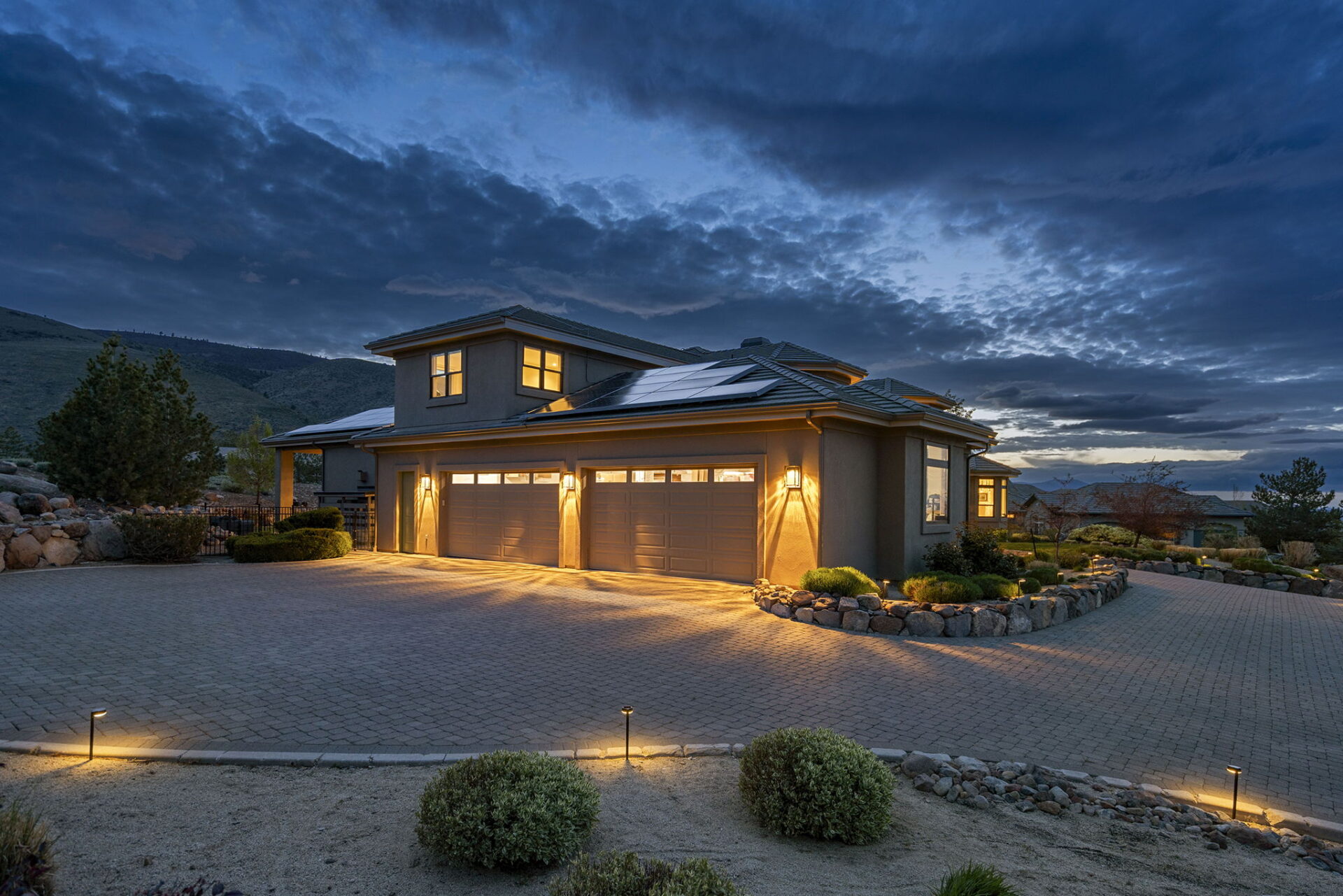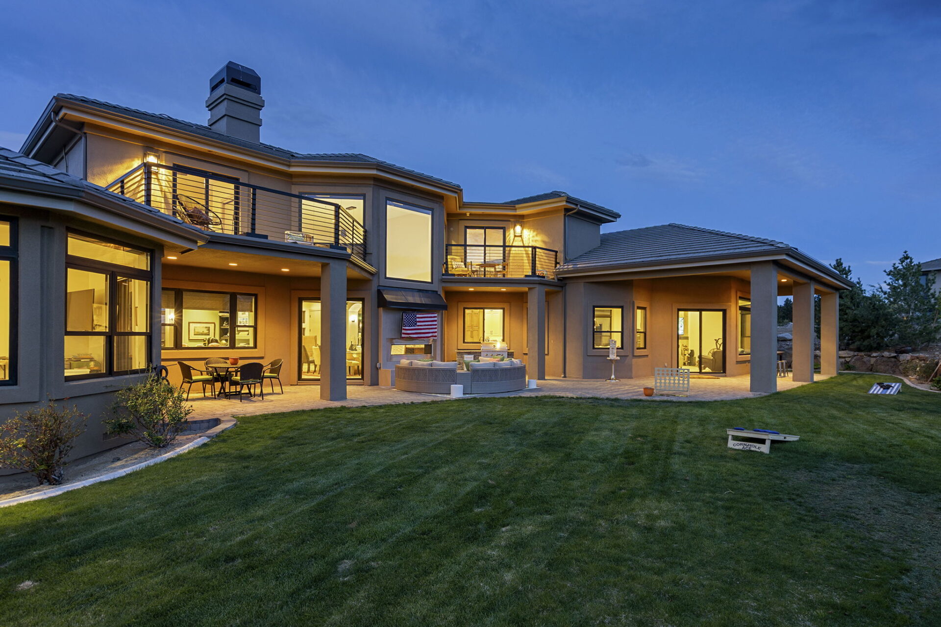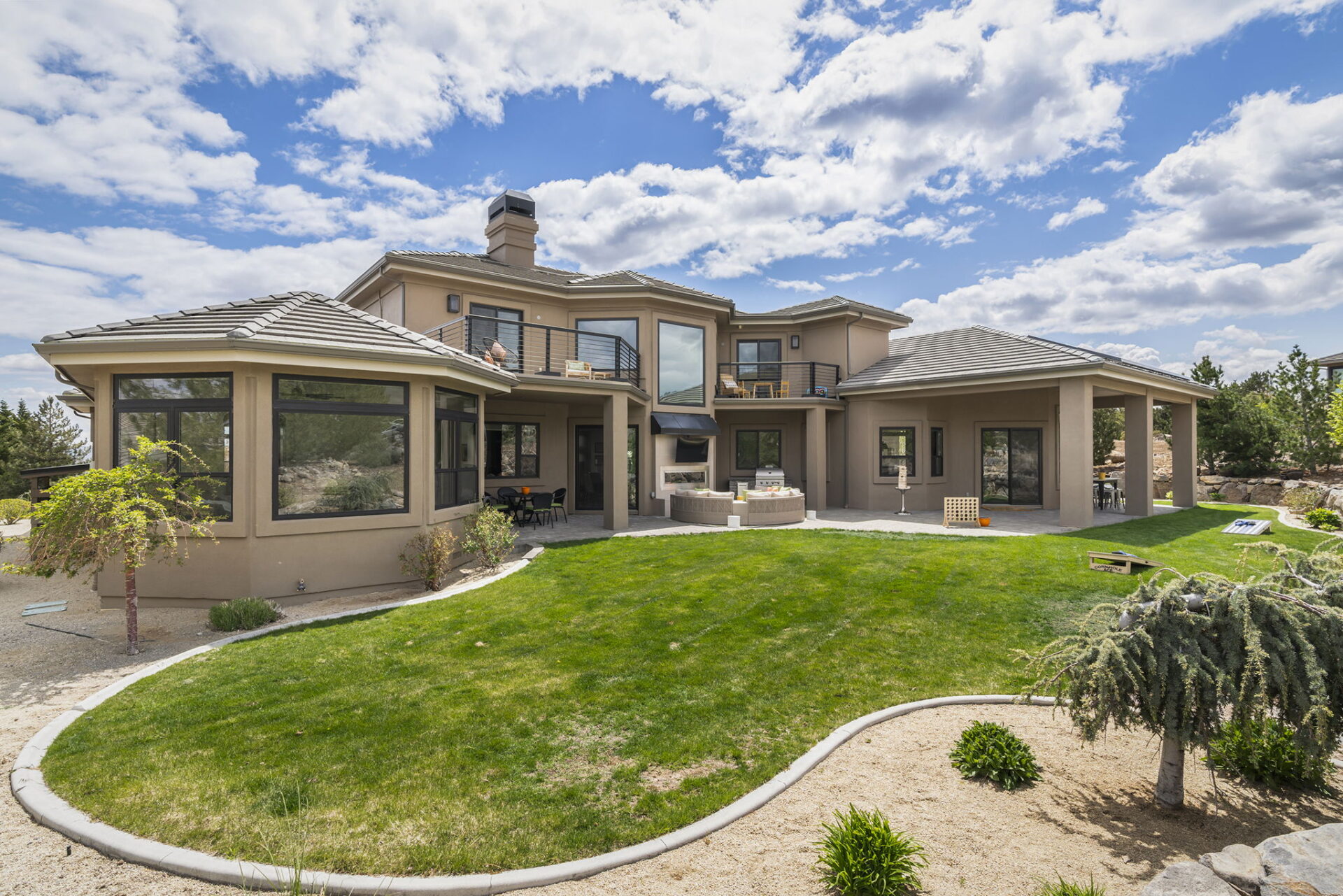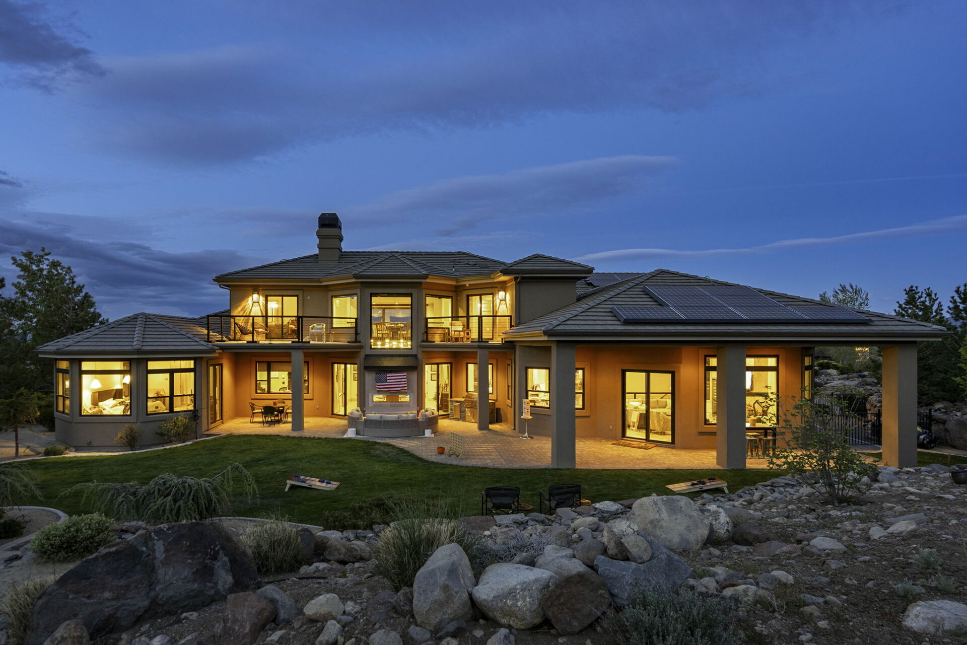 Step into 6177 North Featherstone, a residence reimagined from the ground up to embody the sophistication of design & the effortless grace of High Desert living. Nestled within the prestigious ArrowCreek community, this fully remodeled estate offers 5,586 square feet of inspired living on a full acre. With sweeping views across the Sierra Nevada & Mt. Rose mountains, lush golf fairways, & sparkling city lights, every angle of this home tells a story of elegance & connection to its surroundings. The owners began their remodel with purpose: to create a seamless flow, where form meets function & every detail enhances life, leisure, & entertaining. Walls were softened, pillars removed, & spaces reimagined to capture natural light & open sightlines. Modern finishes & thoughtful design balance grandeur with comfort. A finished basement & upstairs library added 312 square feet, expanding versatility without sacrificing intimacy. Arrival makes an unforgettable impression with a custom 9×6 steel pivot door by Modern Steel Doors of Arizona. Inside, a light-filled foyer leads to an expanded balcony, where sweeping golf course & city views set the stage for sunrise coffee or starlit evenings. At the heart of the home, the Dining Room has been elevated into a dramatic entertaining space with soaring two-story ceilings & a two-sided fireplace connecting indoors & outdoors. Andersen sliding doors open to patios & gardens, while striking Sonneman fixtures & art lighting create ambiance. Whether hosting holidays or intimate dinners, the space adapts with ease. The Main En Suite is a private retreat, complete with custom California Closets, cove lighting, & remote-controlled Hunter Douglas shades. The spa-inspired bath showcases a freestanding soaking tub beneath chandeliers, a dual-entry steam shower with rain head & sprayers, natural stone floors, shimmering glass tile, & custom cabinetry with quartz counters & lighted mirrors. The Great Room centers on a custom travertine fireplace with black quartz mantel, complemented by wood-grain tile floors, a Minka Aire fan, & integrated Sonos audio. The Kitchen & Nook feature a Wolf 48″ range, Sub-Zero refrigerator, & a central island with seating. The Games Room delights with Hubbardton Forge lighting, speakers, & motorized shades. A dramatic staircase of black-stained oak & iron railings rises beneath a cascading Sonneman chandelier. Upstairs, the new Library offers custom bookcases, club seating, & a 12-foot Andersen glass wall opening to a balcony with panoramic views. Four additional en suite bedrooms provide privacy, storage, & character. Outdoors, multiple patios, a two-sided fireplace, & landscaped grounds enhanced with solar lighting create serene gathering spaces. Modern systems include central HVAC with three units, radiant heated floors, Tesla solar panels, Cat-6 wiring, Sonos audio, & a four-car garage with EV charger. This estate is more than a home—it is a lifestyle. From morning coffee on the balcony to wine in the library at dusk, from quiet family nights to grand celebrations, this residence harmonizes elegance, comfort, & versatility. Every space has been thoughtfully crafted, every view a reminder of Reno’s beauty. This is a rare opportunity to own a fully realized vision of home, where luxury & ease coexist seamlessly.