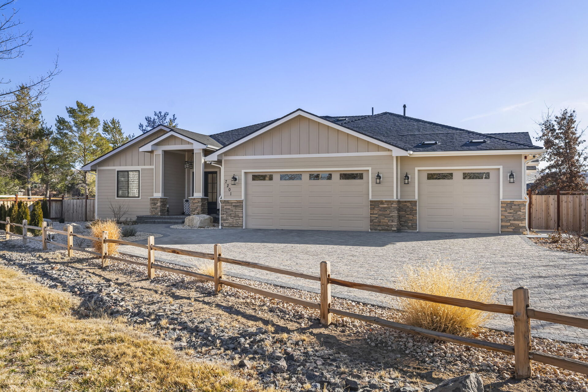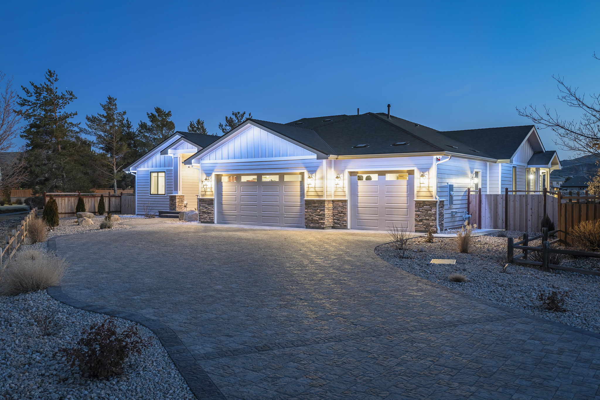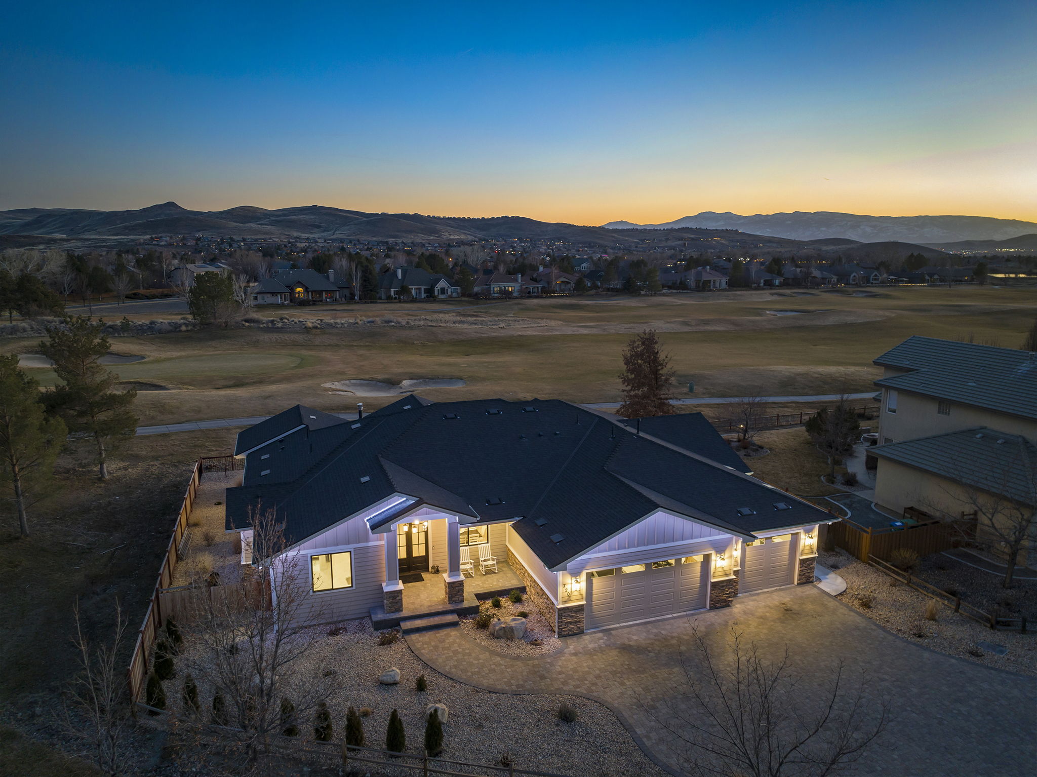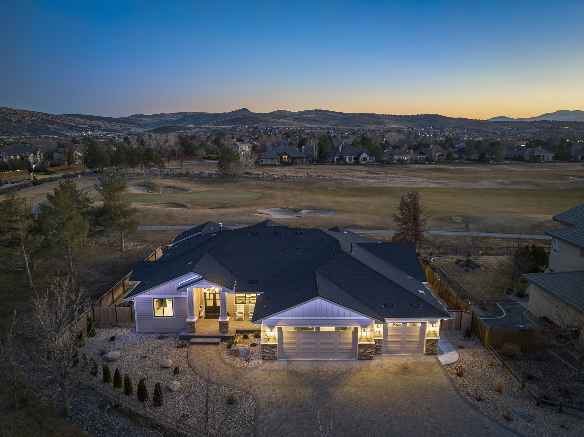 Welcome to 7201 Silver King Drive, where refined luxury meets everyday livability in one of Sparks’ most desirable settings. Situated on an expansive .43-acre lot, this exceptional 3,400-square-foot residence offers 4 bedrooms and 4 bathrooms, thoughtfully designed for those who value panoramic views, modern comfort, and effortless entertaining. From the moment you arrive, the home makes a statement. El Dorado pavers accent the driveway, front porch, and dual rear patios, while dramatic Govee soffit lighting sets the mood after sunset. Smart exterior security, including a Nest Cam with floodlights and motion alerts, provides peace of mind. Inside and out, triple-zone climate control with Nest thermostats ensures year-round comfort at the touch of a button. Step inside to discover hickory wire-brushed engineered hardwood floors flowing through open, light-filled living spaces. The living room is anchored by a striking floor-to-ceiling stacked stone and honed marble linear gas fireplace with color-changing glass accents, complemented by custom built-in cabinetry and motorized dual-shade window coverings that blend style with smart technology. The chef’s kitchen is a true showpiece—featuring custom soft-close shaker cabinetry, premium pull-outs, titanium leathered granite countertops, and ZLINE Autograph Edition professional-grade appliances. A hidden pantry entrance discreetly reveals both an expansive storage area and a thoughtfully designed laundry space, complete with custom cabinetry and a granite sink—an elegant blend of convenience and design. The primary suite is a private retreat designed for total relaxation. Enjoy radiant heated flooring, an oversized walk-in shower with LED lighting and Bluetooth speakers, and an extra-deep soaking tub. The custom walk-in closet system completes the space with elegance and organization. Additional highlights include a spacious 3-car garage with two EV charging stations, a secondary kitchen with beverage bar and wine refrigerator, and multiple outdoor living areas ideal for entertaining or unwinding while taking in the views. At 7201 Silver King Drive, luxury isn’t just seen—it’s felt. This is a home where comfort, technology, and design come together to create an elevated lifestyle you’ll love coming home to.