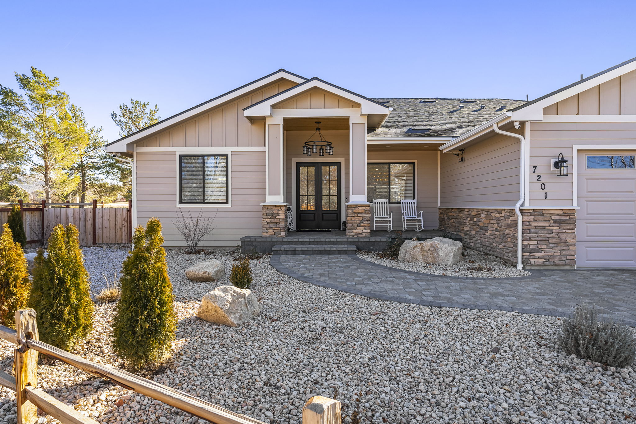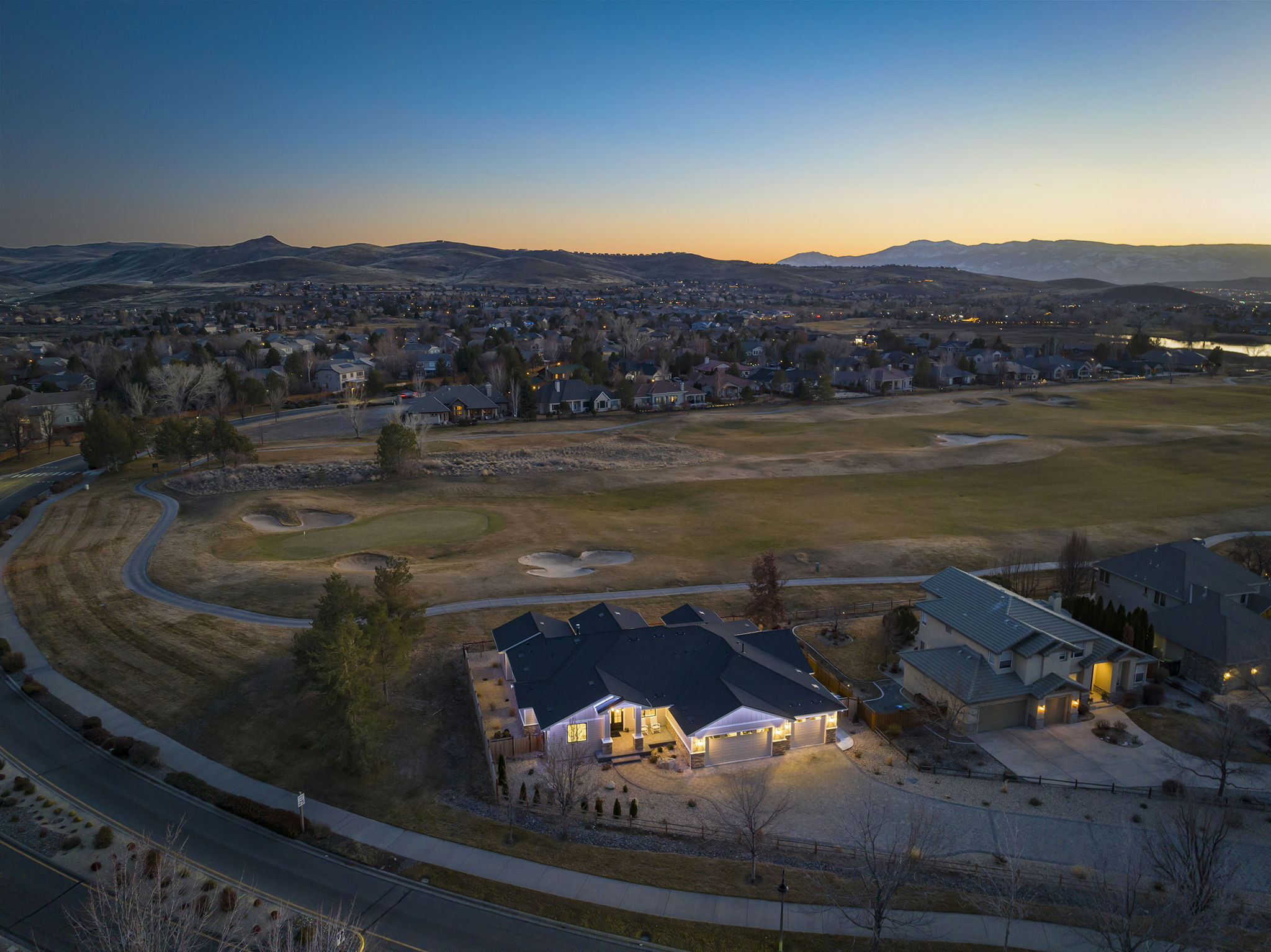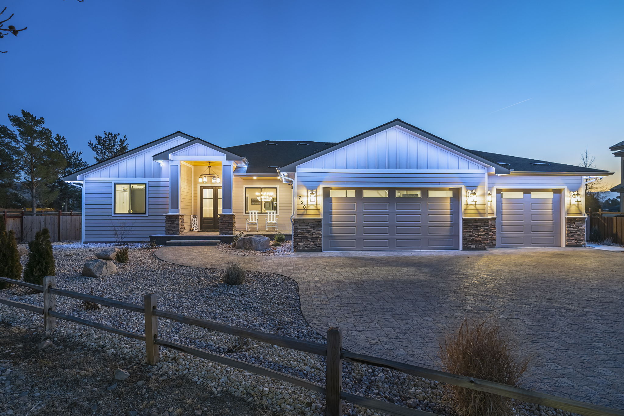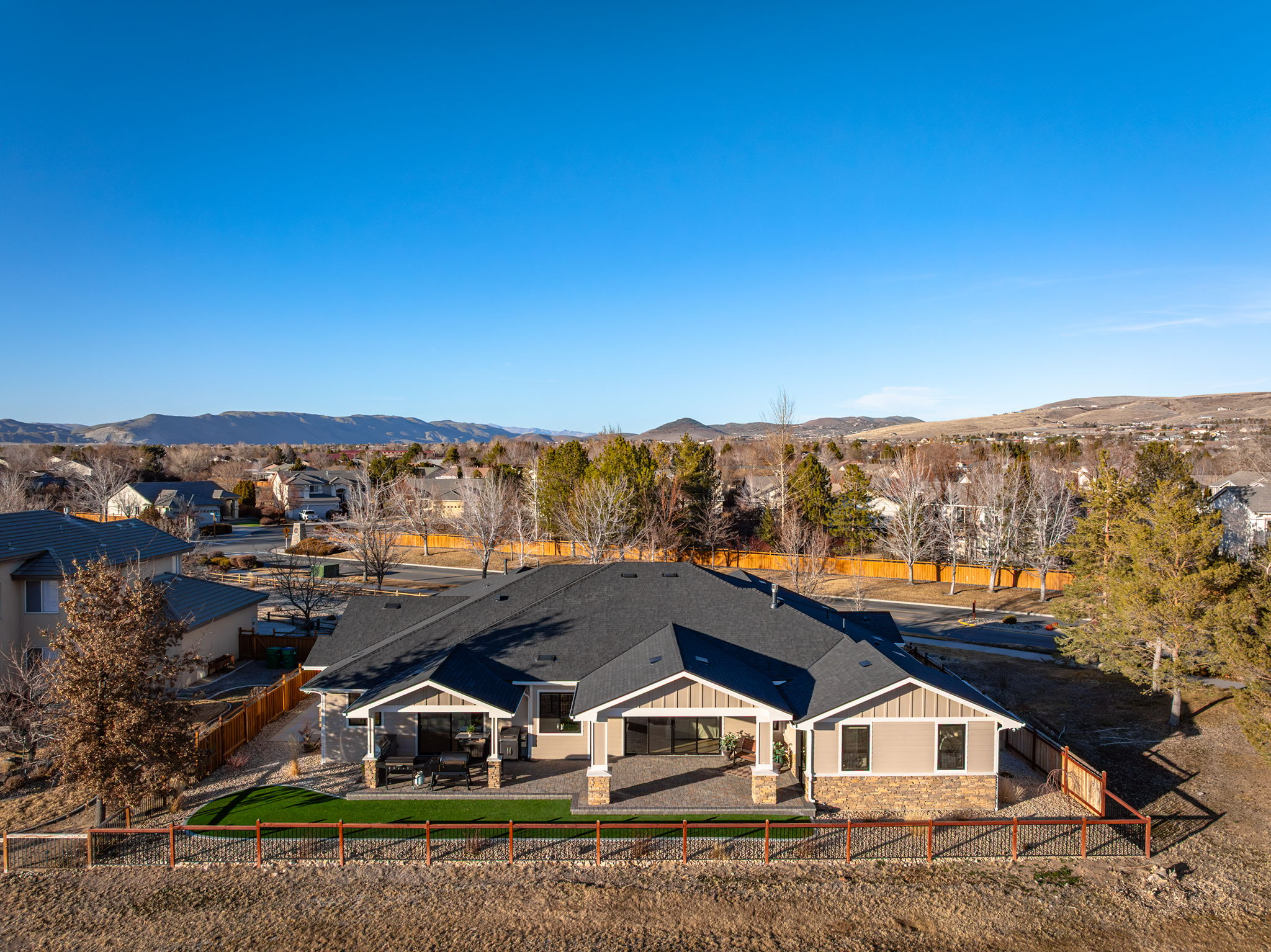 Welcome to 7201 Silver King Drive, where refined luxury meets everyday livability in one of Sparks’ most desirable settings. Situated on an expansive .43-acre lot, this exceptional 3,400-square-foot residence offers 4 bedrooms and 4 bathrooms, thoughtfully designed for those who value panoramic views, modern comfort, and effortless entertaining. From the moment you arrive, the home makes a statement. El Dorado pavers accent the driveway, front porch, and dual rear patios, while dramatic Govee soffit lighting sets the mood after sunset. Smart exterior security, including a Nest Cam with floodlights and motion alerts, provides peace of mind. Inside and out, triple-zone climate control with Nest thermostats ensures year-round comfort at the touch of a button. Step inside to discover hickory wire-brushed engineered hardwood floors flowing through open, light-filled living spaces. The living room is anchored by a striking floor-to-ceiling stacked stone and honed marble linear gas fireplace with color-changing glass accents, complemented by custom built-in cabinetry and motorized dual-shade window coverings that blend style with smart technology. The chef’s kitchen is a true showpiece—featuring custom soft-close shaker cabinetry, premium pull-outs, titanium leathered granite countertops, and ZLINE Autograph Edition professional-grade appliances. A hidden pantry entrance discreetly reveals both an expansive storage area and a thoughtfully designed laundry space, complete with custom cabinetry and a granite sink—an elegant blend of convenience and design. The primary suite is a private retreat designed for total relaxation. Enjoy radiant heated flooring, an oversized walk-in shower with LED lighting and Bluetooth speakers, and an extra-deep soaking tub. The custom walk-in closet system completes the space with elegance and organization. Additional highlights include a spacious 3-car garage with two EV charging stations, a secondary kitchen with beverage bar and wine refrigerator, and multiple outdoor living areas ideal for entertaining or unwinding while taking in the views. At 7201 Silver King Drive, luxury isn’t just seen—it’s felt. This is a home where comfort, technology, and design come together to create an elevated lifestyle you’ll love coming home to.