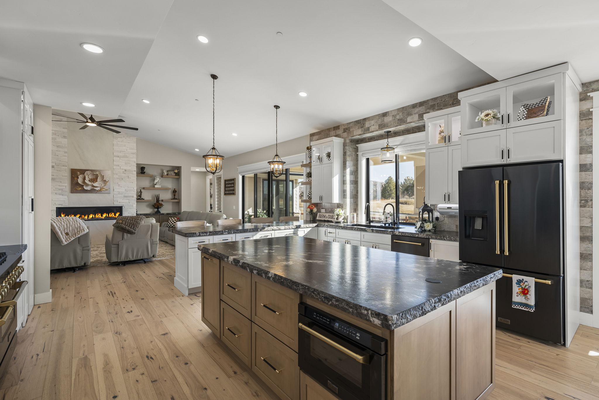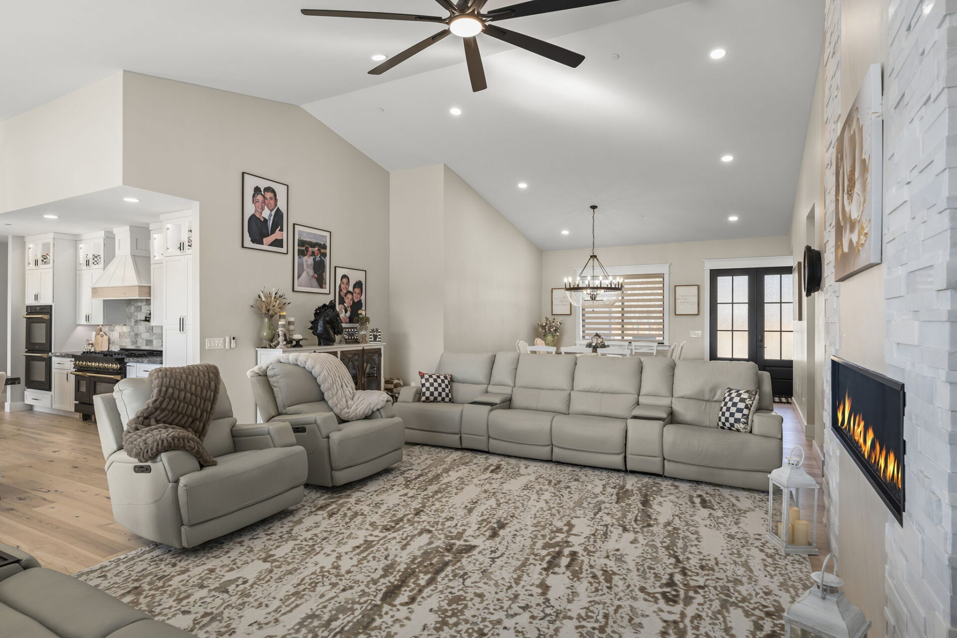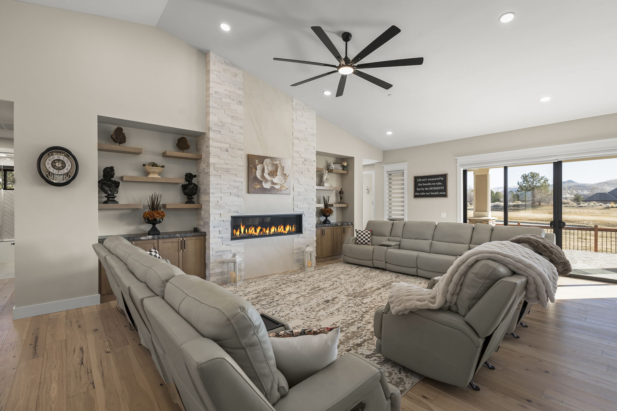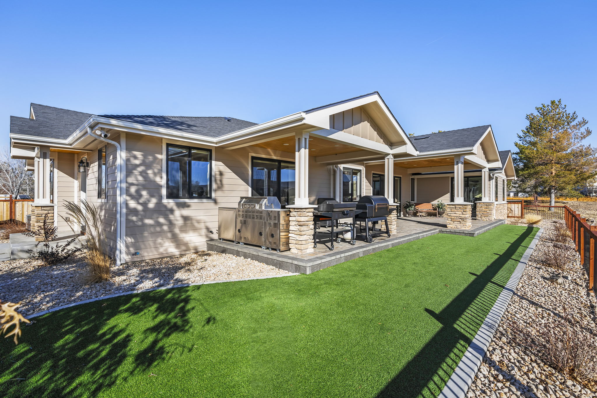 Welcome to 7201 Silver King Drive, where refined luxury meets everyday livability in one of Sparks’ most desirable settings. Situated on an expansive .43-acre lot, this exceptional 3,400-square-foot residence offers 4 bedrooms and 4 bathrooms, thoughtfully designed for those who value panoramic views, modern comfort, and effortless entertaining. From the moment you arrive, the home makes a statement. El Dorado pavers accent the driveway, front porch, and dual rear patios, while dramatic Govee soffit lighting sets the mood after sunset. Smart exterior security, including a Nest Cam with floodlights and motion alerts, provides peace of mind. Inside and out, triple-zone climate control with Nest thermostats ensures year-round comfort at the touch of a button. Step inside to discover hickory wire-brushed engineered hardwood floors flowing through open, light-filled living spaces. The living room is anchored by a striking floor-to-ceiling stacked stone and honed marble linear gas fireplace with color-changing glass accents, complemented by custom built-in cabinetry and motorized dual-shade window coverings that blend style with smart technology. The chef’s kitchen is a true showpiece—featuring custom soft-close shaker cabinetry, premium pull-outs, titanium leathered granite countertops, and ZLINE Autograph Edition professional-grade appliances. A hidden pantry entrance discreetly reveals both an expansive storage area and a thoughtfully designed laundry space, complete with custom cabinetry and a granite sink—an elegant blend of convenience and design. The primary suite is a private retreat designed for total relaxation. Enjoy radiant heated flooring, an oversized walk-in shower with LED lighting and Bluetooth speakers, and an extra-deep soaking tub. The custom walk-in closet system completes the space with elegance and organization. Additional highlights include a spacious 3-car garage with two EV charging stations, a secondary kitchen with beverage bar and wine refrigerator, and multiple outdoor living areas ideal for entertaining or unwinding while taking in the views. At 7201 Silver King Drive, luxury isn’t just seen—it’s felt. This is a home where comfort, technology, and design come together to create an elevated lifestyle you’ll love coming home to.